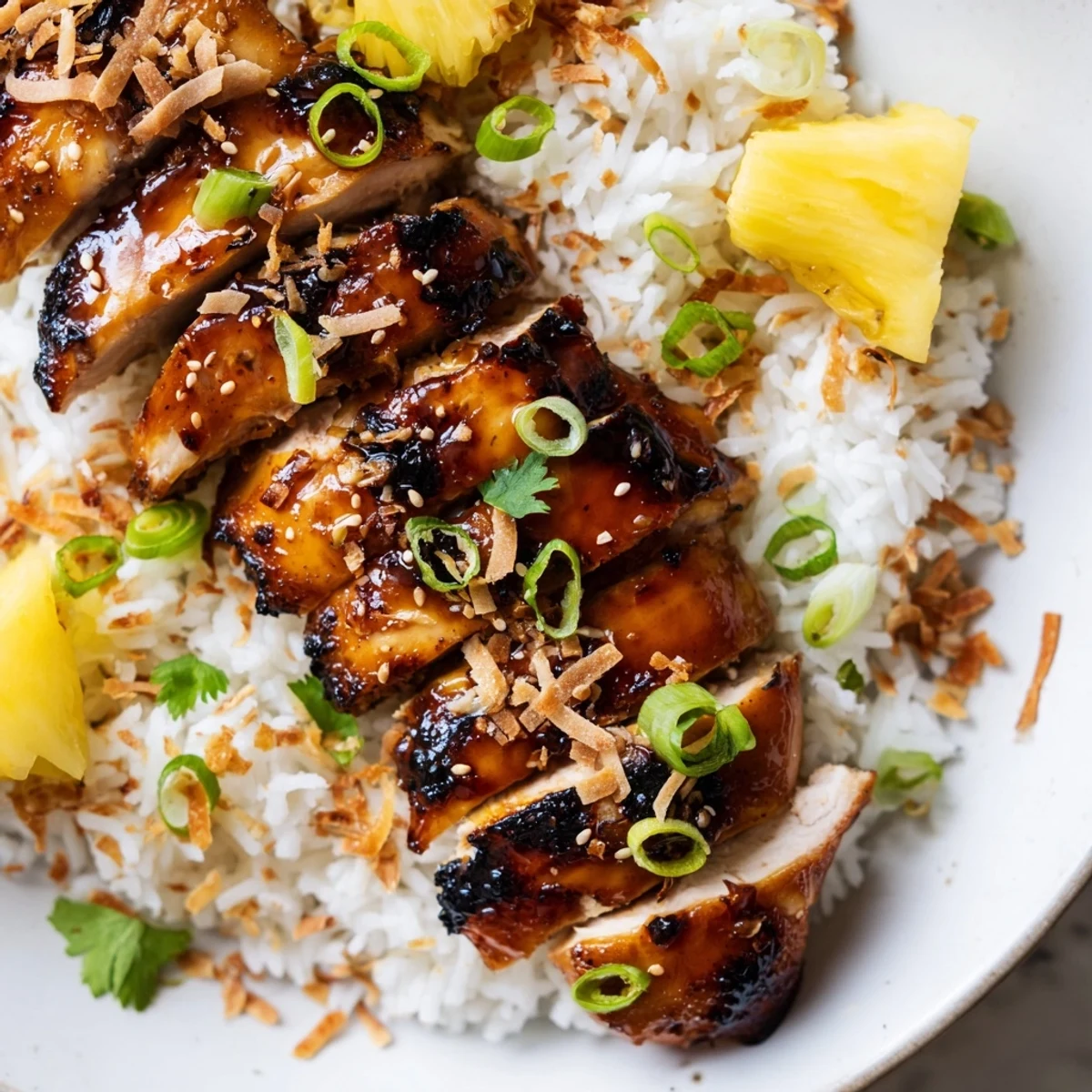 - Pile coconut rice into bowls, top with chicken, and scatter pineapple, green onions, coconut, sesame seeds, and cilantro over everything.