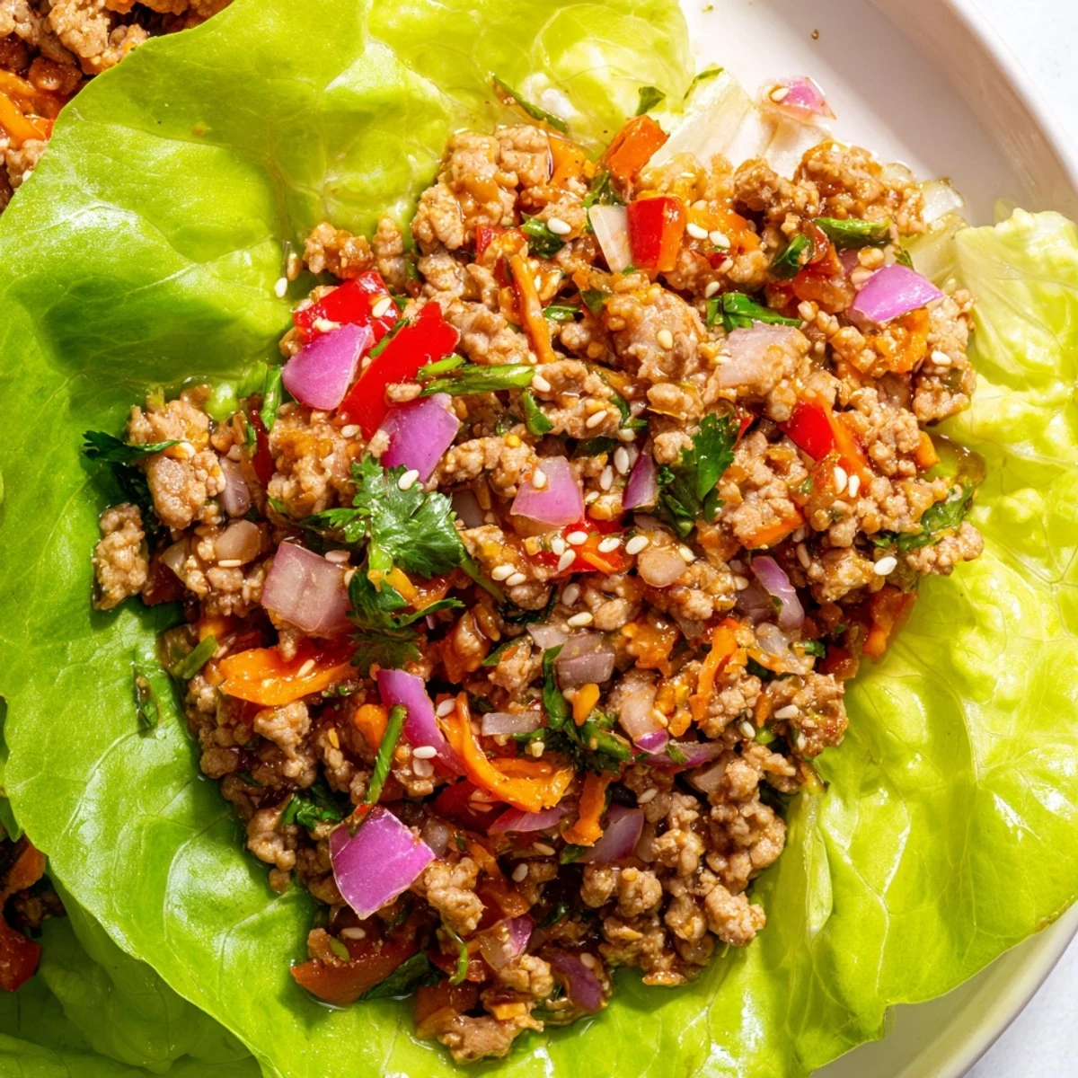 These refreshing lettuce bowl wraps feature lean ground turkey cooked with aromatic garlic, onions, and bell peppers in a savory soy-hoisin glaze. The mixture gets extra crunch from shredded carrots and diced cucumbers, while fresh cilantro and toasted sesame seeds add bright flavor notes. Each crisp lettuce cup becomes an edible vessel for this light yet satisfying protein-packed meal.