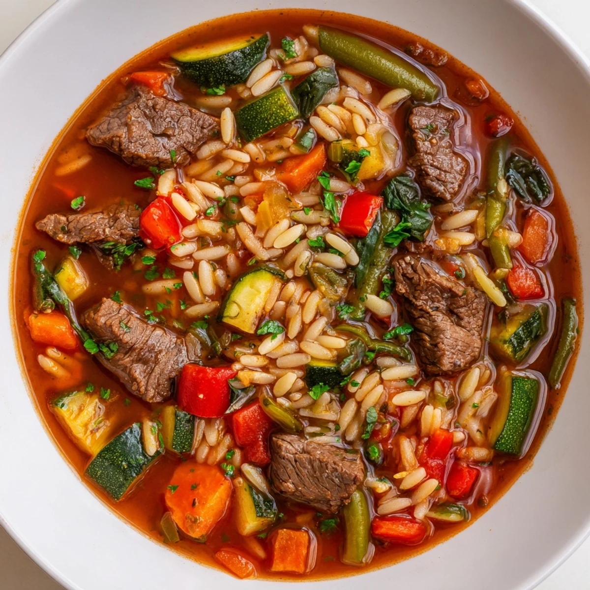 My neighbor brought over a basket of vegetables from her garden last summer, and this soup was born from that abundance. I had some stew meat in the freezer and a half-box of orzo gathering dust in the pantry. The way the zucchini and green beans melted into the broth felt like discovering something new about a dish I thought I knew.