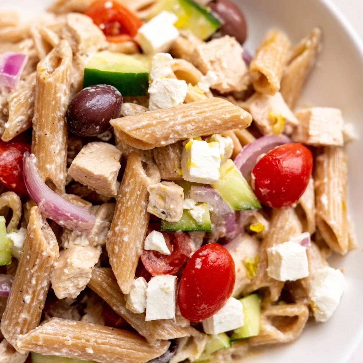This satisfying Mediterranean bowl combines whole wheat penne with tender chicken breast, crisp cucumber, juicy cherry tomatoes, and tangy feta. The creamy Greek yogurt dressing with lemon, garlic, and oregano ties everything together beautifully.