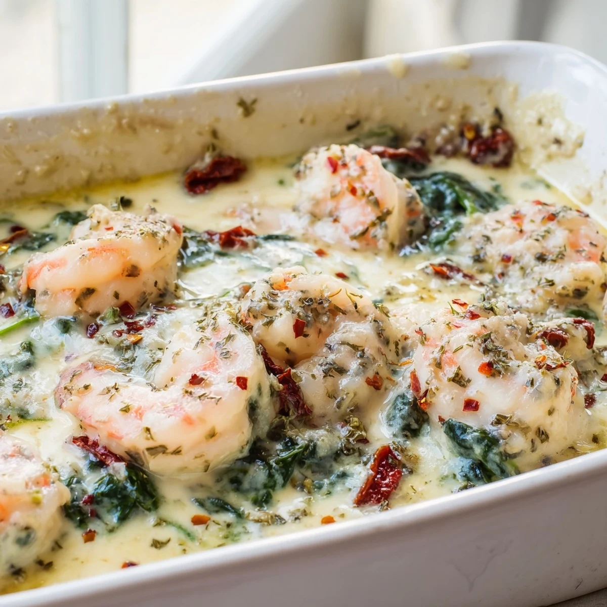 This creamy Tuscan-inspired shrimp bake combines succulent shrimp with a rich, velvety sauce made from heavy cream, sun-dried tomatoes, and fresh spinach. The dish delivers authentic Italian flavors through dried herbs, garlic, and Parmesan, while keeping carbohydrates minimal at just 7g per serving. Perfect for busy weeknights, this one-pan meal comes together in 40 minutes total—15 minutes of prep and 25 minutes in the oven.