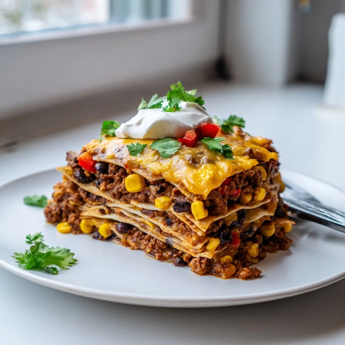 - Let the dish rest for 5 minutes before slicing, which helps the layers set, then garnish with fresh cilantro, jalapeños, and sour cream
