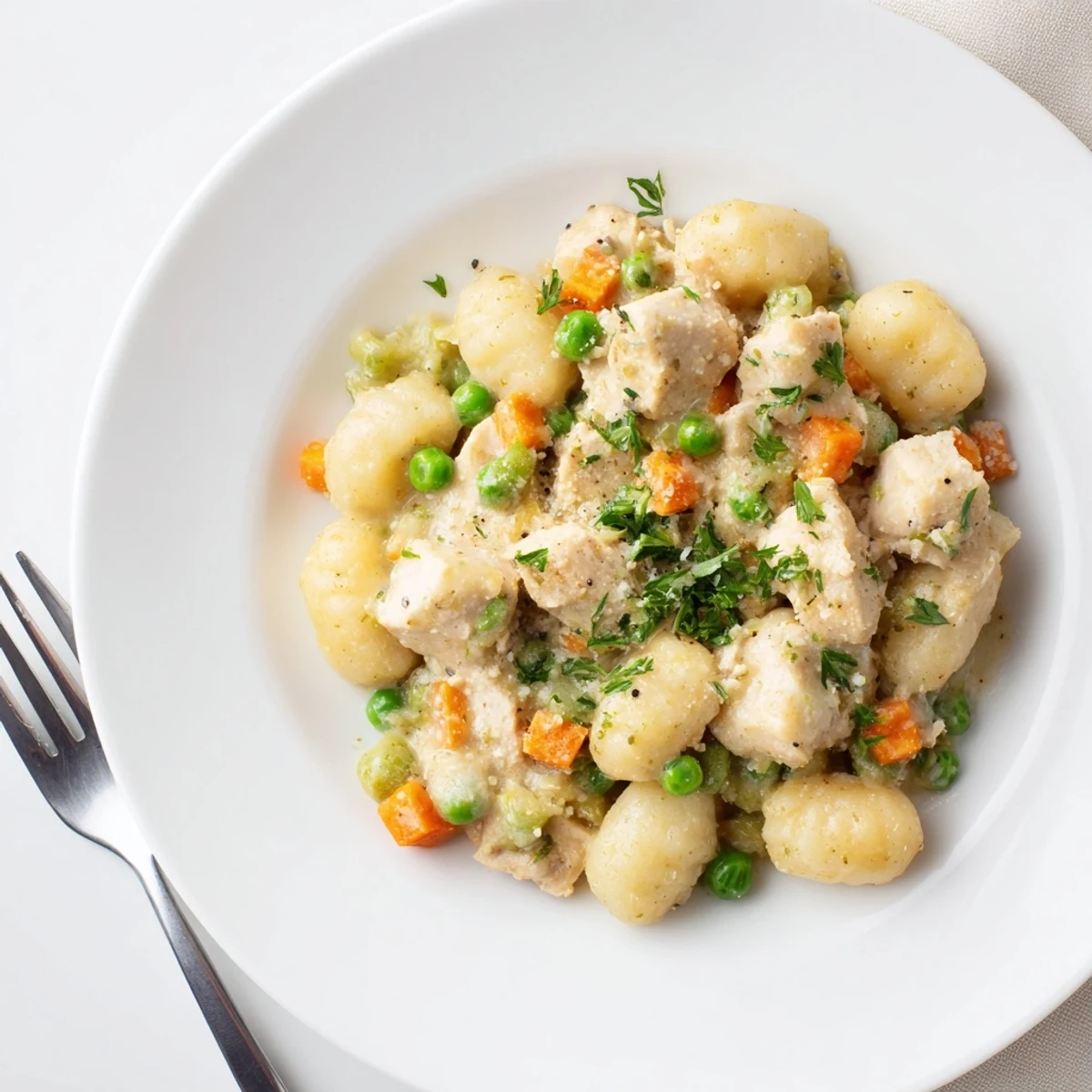 The sauce base starts with a roux made from butter and flour, then enriched with chicken broth and milk or cream. Dried thyme and sage add that familiar pot pie flavor profile, while the gnocchi cooks directly in the sauce, absorbing all the savory flavors as it simmers.