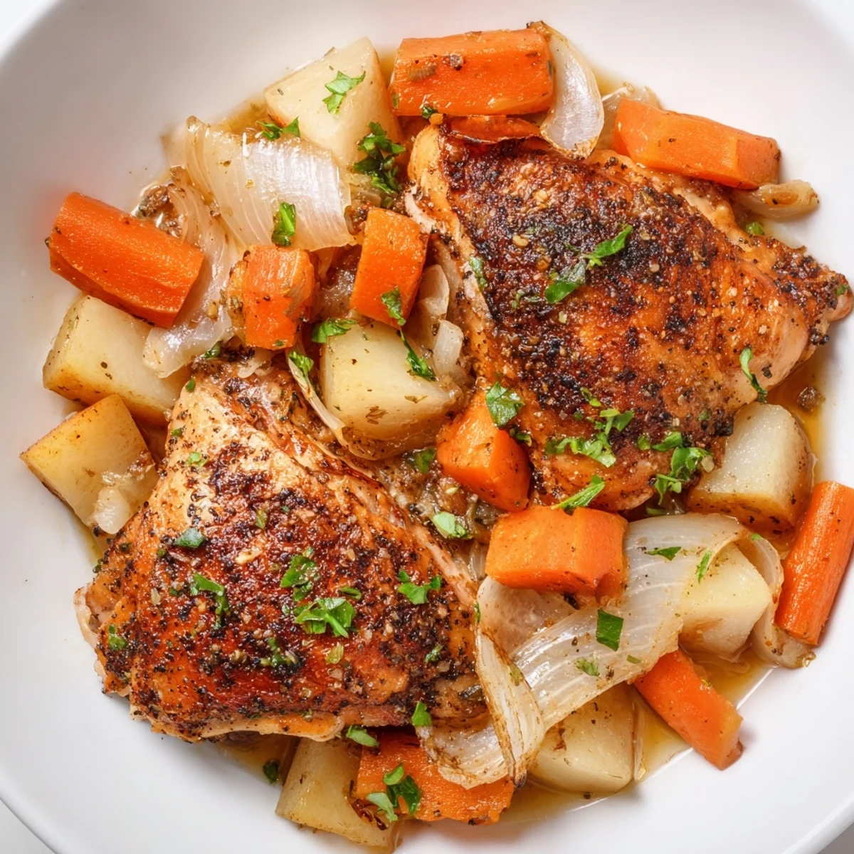 This comforting chicken dinner features bone-in thighs slow-cooked for six hours with chunked carrots, potatoes, onions, and celery. The meat becomes incredibly tender while absorbing flavors from dried thyme, rosemary, and paprika. A simple chicken broth creates a savory sauce that ties everything together.