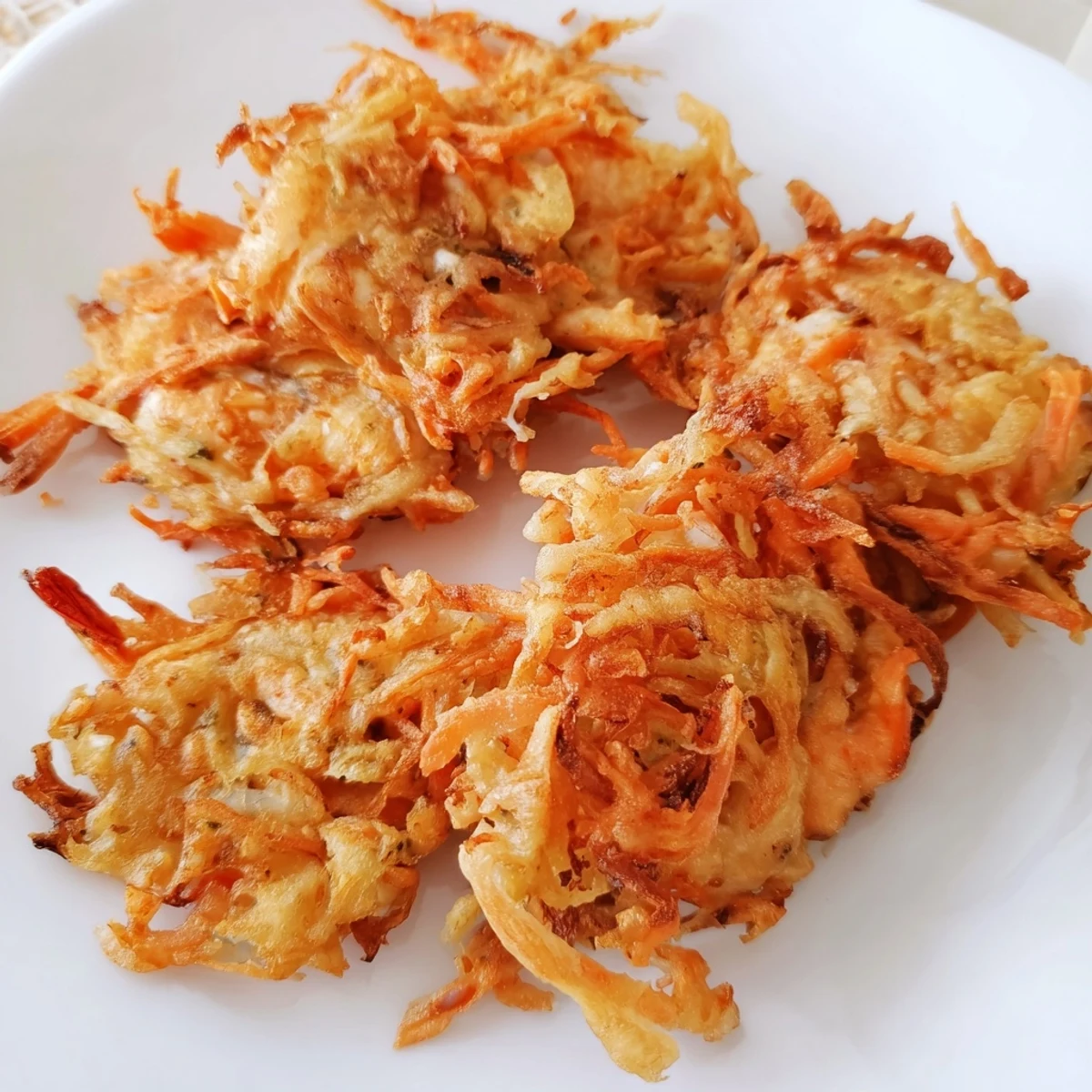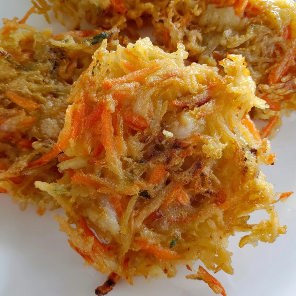 - Sweet potato and carrot: Julienned thinly, these provide natural sweetness and structure to each fritter